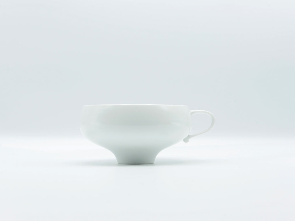 カップは、飲み口から中央部分にかけてふんわりと外に広がり、そのまま高台にかけてゆるやかな曲線で繋がったデザイン。人差し指がちょうど入るくらいの持ち手は薄く繊細です。